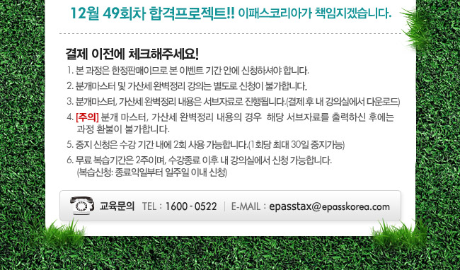 사업자등록번호 105-86-56986 ㅣ 통신판매업신고번호 2005-02554 ㅣ 원격평생교육시설신고 제52호 서울특별시 영등포구 경인로 775 에이스하이테크시티 2동 10층 (주)이패스코리아 대표이사: 이재남 ㅣ 개인정보보호책임자 : 나현철 COPYRIGHT 2003-2024 EPASSKOREA. ALL RIGHTS RESERVED. 패밀리사이트 이패스비즈 이패스노무사 이패스관세사 이패스손사 이패스행정사 이패스 국민내일배움카드 한국증권금융연구소[KOSFI] AIFA (주)아이파경영아카데미 AIFA (주)국제금융회계아카데미 AIFA 우리경영아카데미