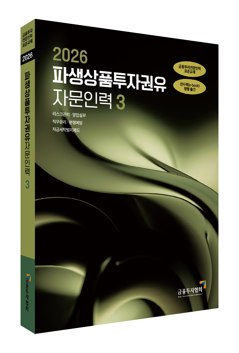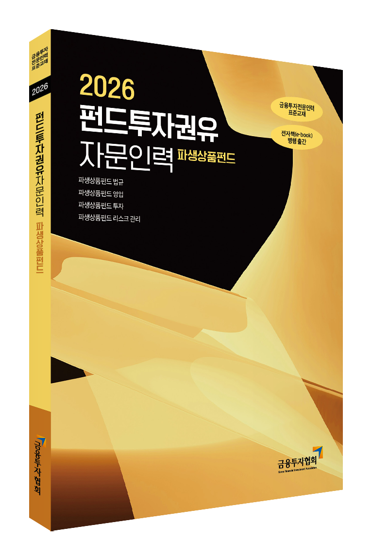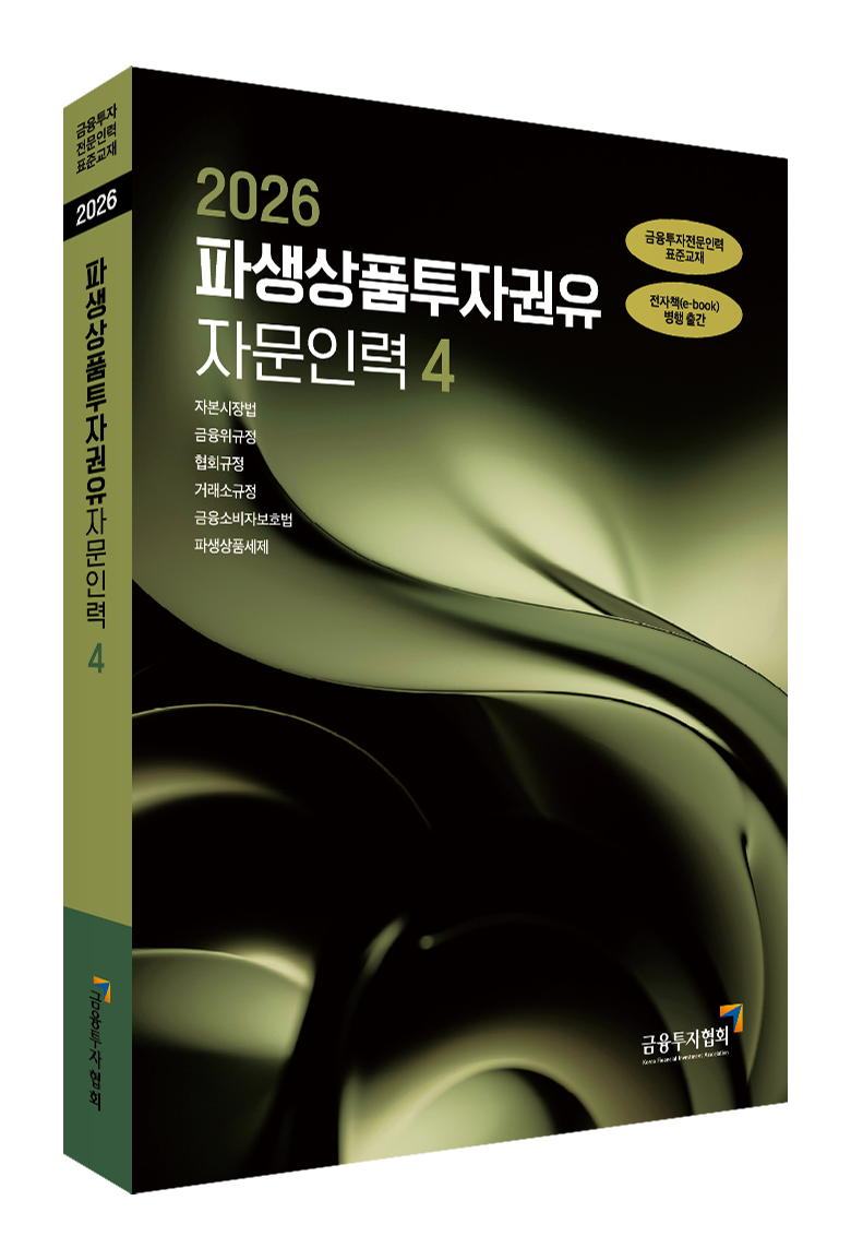 온라인서점국제자격도서 - CFA - FRM - CAIA - CAMS금융투자자격도서 - 증권금융기초입문 - 펀드투자권유대행인 - 증권투자권유대행인 - 펀드투자권유자문인력 - 증권투자권유자문인력 - 파생상품투자권유자문인력 - 투자자산운용사 - 금융투자분석사 - 재무위험관리사은행/무역/보험자격도서 - 자산관리사(은행 FP) - 은행텔러 - 외환전문역 - 국제무역사/무역영어 - 원산지관리사 - AFPK - CFP - 보세사 - 물류관리사 - 유통관리사 2급 - 신용분석사 - TPAC금융일반도서 - 금융일반세무회계자격도서 - 전산세무/회계 - 세무회계 - TAT/FAT - 재경/회계관리사 - IFRS관리사 - 세무/회계 실무기술자격증도서 - 공조냉동기계 - 정보통신 - 실내건축 - 자동차정비 - 용접 - 에너지관리 - 소방설비 - 식물보호 - 산업위생관리 - 산업안전 - 건설안전 - 산업안전지도사 - 전기 - 가스 - 수질환경 - 컴퓨터활용능력한국사도서 - 한국사능력검정시험소방승진 - 소방전술 - 소방공무원법 - 소방법령II - 위험물안전관리법 - 다중이용업소법 - 행정법 - 봉투 모의고사 - 가산점 고객센터 교육문의 1600-0522 평일 09:00~21:00 토/일요일 09:00~18:00 담당자별 내선보기 온라인서점 바로가기 강의 교재 구매홈>온라인서점>금융투자자격도서 - 신청하신 교육과정의 교재를 구매하 실 수 있습니다. 2026 펀드투자권유자문인력 2 편저 : 금융투자교육원 (http://www.kifin.or.kr/) 발행처 : 한국금융투자협회 (http://license.kofia.or.kr/) 출판사: 금융투자교육원|출판년도: 2026년 15,500원 15,500원 0원 구매하기 장바구니담기 2026 파생상품투자권유자문인력 3 편저 : 금융투자교육원 (http://www.kifin.or.kr/) 발행처 : 한국금융투자협회 (http://license.kofia.or.kr/) 출판사: 금융투자교육원|출판년도: 2026년 18,000원 18,000원 0원 구매하기 장바구니담기 2026 펀드투자권유자문인력(파생상품펀드) 편저 : 금융투자교육원 (http://www.kifin.or.kr/) 발행처 : 한국금융투자협회 (http://license.kofia.or.kr/) 출판사: 금융투자교육원|출판년도: 2026년 12,000원 12,000원 0원 구매하기 장바구니담기 2026 파생상품투자권유자문인력 4 편저 : 금융투자교육원 (http://www.kifin.or.kr/) 발행처 : 한국금융투자협회 (http://license.kofia.or.kr/) 출판사: 금융투자교육원|출판년도: 2026년 21,000원 21,000원 0원 구매하기 장바구니담기 < 11 12 13 14 15 >