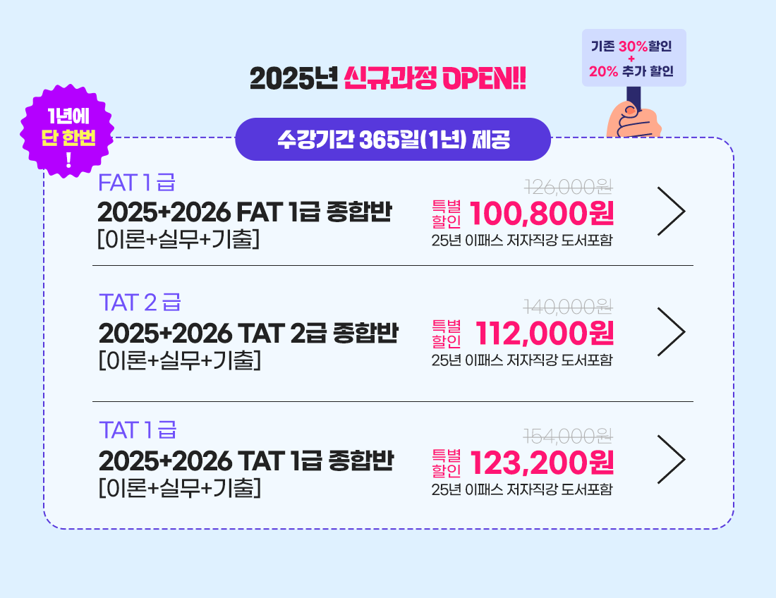 FAT 1급과 동시에 준비하면서 TAT 2급도 겹치는 부분이 많아가지고 수월하게 동시에 준비 할 수 있었습니다.